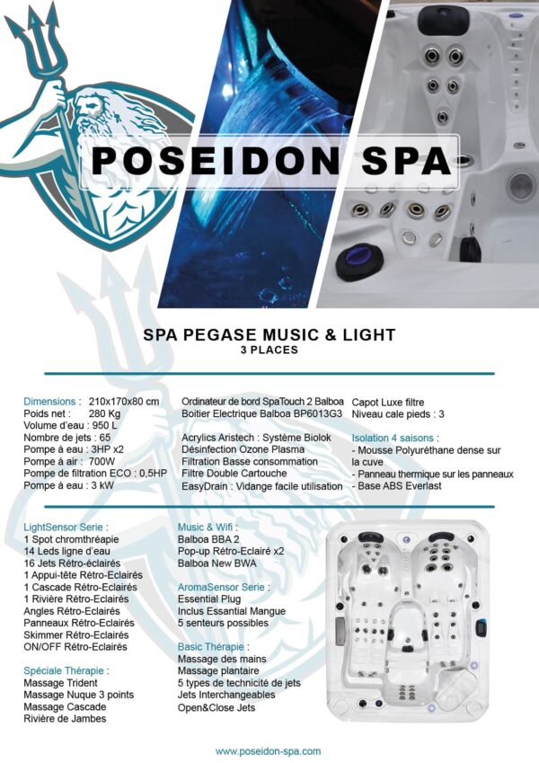 Un magnifique modèle 3 places offrant deux banquettes allongées et une place assise avec l’option Music & Light. Il dispose en plus du spa Pégase classique, de de nombreuses options supplémentaires. D’aspect visuel, de splendides corners rétro-éclairés en acrylique viennent habiller votre spa.