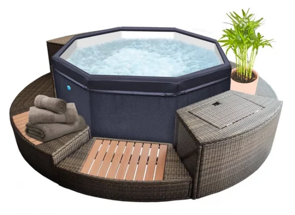 Harmonisez votre Octopus à votre style personnel. Son habit extérieur en PVC noir tressé offre à votre spa une finition discrète qui apportera élégance à votre décoration. Pourquoi ne pas l’agrémenter du mobilier assorti : étagère, banc, marchepied et parasol.